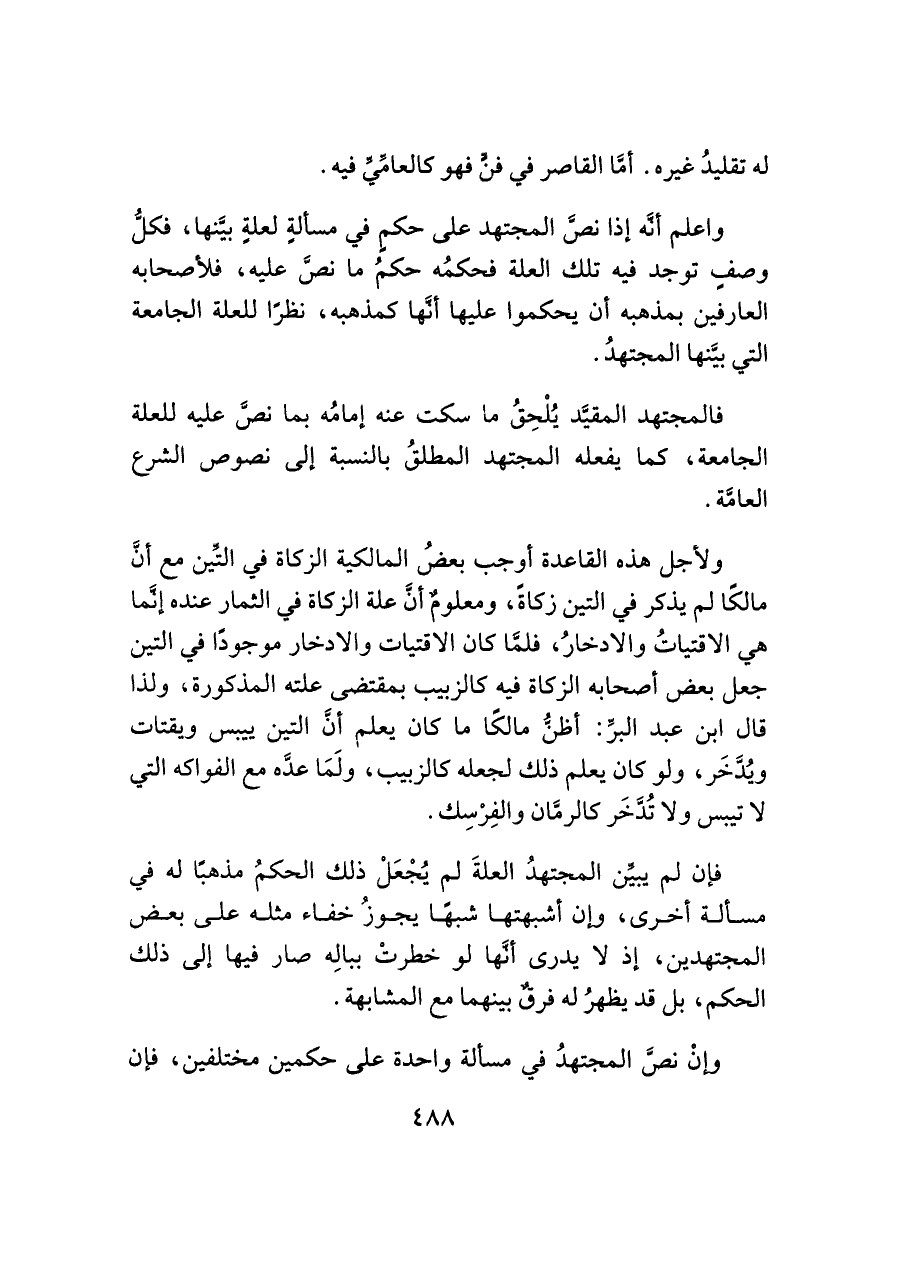 ولأجل هذه القاعدة أوجب بعضُ المالكية الزكاة في التِّين مع أنَّ مالكًا لم يذكر في التين زكاةً، ومعلومٌ أنَّ علة الزكاة في الثمار عنده إنَّما هي الاقتياتُ والادخارُ، فلمَّا كان الاقتيات والادخار موجودًا في التين جعل بعض أصحابه الزكاة فيه كالزبيب بمقتضى علته المذكورة، ولذا قال ابن عبد البرِّ: أظنُّ مالكًا ما كان يعلم أنَّ التين ييبس ويقتات ويُدَّخَر، ولو كان يعلم ذلك لجعله كالزبيب، ولَمَا عدَّه مع الفواكه التي لا تيبس ولا تُدَّخَر كالرمَّان والفِرْسِك.