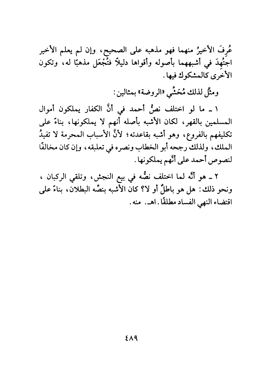 ١ - ما لو اختلف نصُّ أحمد في أنَّ الكفار يملكون أموال المسلمين بالقهر، لكان الأشبه بأصله أنهم لا يملكونها، بناءً على تكليفهم بالفروع، وهو أشبه بقاعدته؛ لأنَّ الأسباب المحرمة لا تفيدُ الملك، ولذلك رجحه أبو الخطاب ونصره في تعليقه، وإن كان مخالفًا لنصوص أحمد على أنَّهم يملكونها.