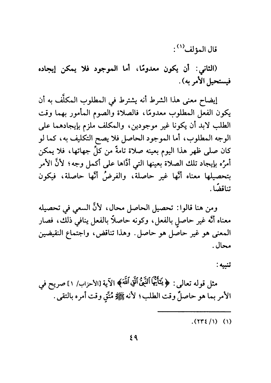 (الثاني: أن يكون معدومًا، أما الموجود فلا يمكن إيجاده فيستحيل الأمر به).