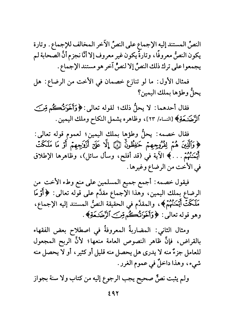 فيقول خصمه: أجمع جميع المسلمين على منع وطء الأخت من الرضاع بملك اليمين، وهذا الإجماع مقدَّم على قوله تعالى: {أَوْ مَا مَلَكَتْ أَيْمَانُهُمْ}، والمقدَّم في الحقيقة النصُّ المستند إليه الإجماع، وهو قوله تعالى: {وَأَخَوَاتُكُمْ مِنَ الرَّضَاعَةِ}.