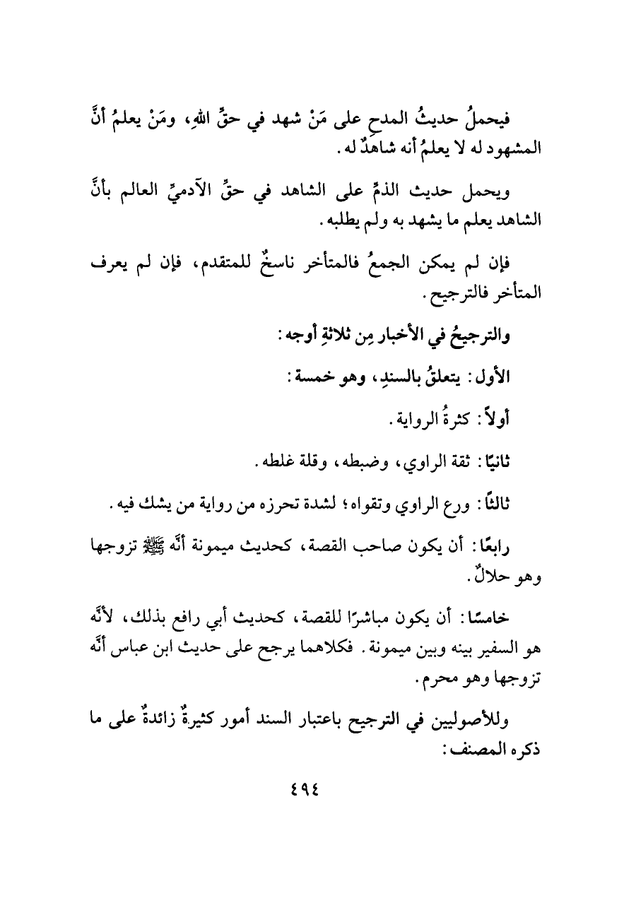 خامسًا: أن يكون مباشرًا للقصة، كحديث أبي رافع بذلك، لأنَّه هو السفير بينه وبين ميمونة. فكلاهما يرجح على حديث ابن عباس أنَّه تزوجها وهو محرم.