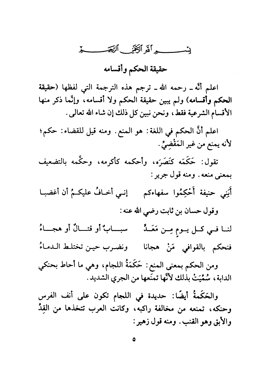 اعلم أنَّ الحكم في اللغة: هو المنع. ومنه قيل للقضاء: حكم؛ لأنه يمنع من غير المَقْضِيِّ.