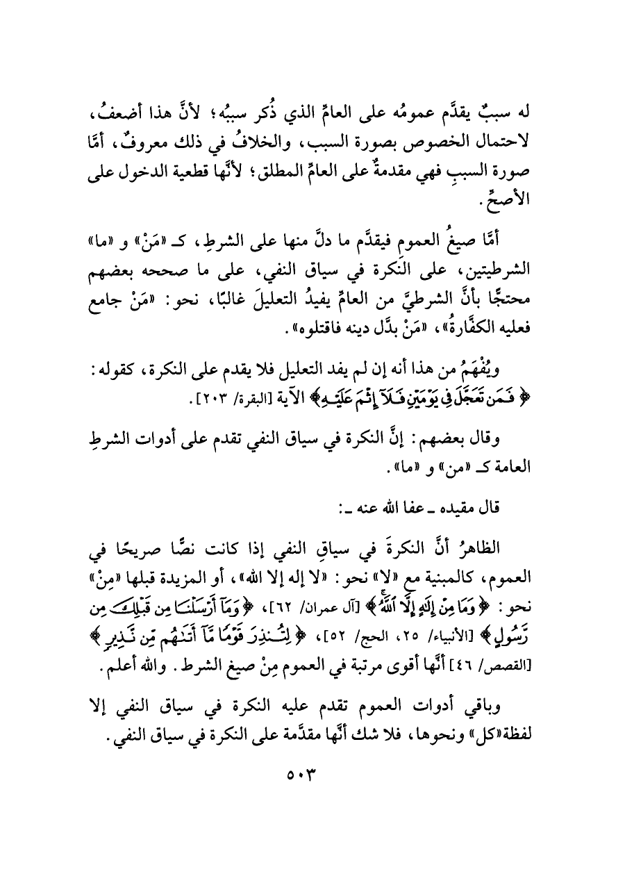 أمَّا صيغُ العمومِ فيقدَّم ما دلَّ منها على الشرطِ، كـ "مَنْ" و"ما" الشرطيتين، على النكرة في سياق النفي، على ما صححه بعضهم محتجًّا بأنَّ الشرطيَّ من العائم يفيدُ التعليلَ غالبًا، نحو: "مَنْ جامع فعليه الكفَّارةُ"، "مَنْ بدَّل دينه فاقتلوه".