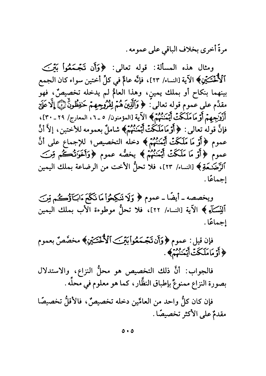 ومثال هذه المسألة: قوله تعالى: {وَأَنْ تَجْمَعُوا بَيْنَ الْأُخْتَيْنِ} الآية [النساء/ ٢٣]، فإنَّه عامٌّ في كلِّ أختين سواء كان الجمع بينهما بنكاح أو بملك يمين، وهذا العامُّ لم يدخله تخصيصٌ، فهو مقدَّم على عموم قوله تعالى: {وَالَّذِينَ هُمْ لِفُرُوجِهِمْ حَافِظُونَ (٥) إِلَّا عَلَى أَزْوَاجِهِمْ أَوْ مَا مَلَكَتْ أَيْمَانُهُمْ} [المؤمنون/ ٥، ٦، المعارج/ ٢٩ - ٣٠]، فإنَّ قوله تعالى: {أَوْ مَا مَلَكَتْ أَيْمَانُهُمْ} شاملٌ بعمومه للأختين، إلَّا أنَّ عموم {أَوْ مَا مَلَكَتْ أَيْمَانُهُمْ} دخله التخصيص؛ للإجماع على أنَّ عموم {أَوْ مَا مَلَكَتْ أَيْمَانُهُمْ} يخصُّه عموم {وَأَخَوَاتُكُمْ مِنَ الرَّضَاعَةِ} [النساء/ ٢٣]، فلا تحلُّ الأخت من الرضاعة بملك اليمين إجماعًا.