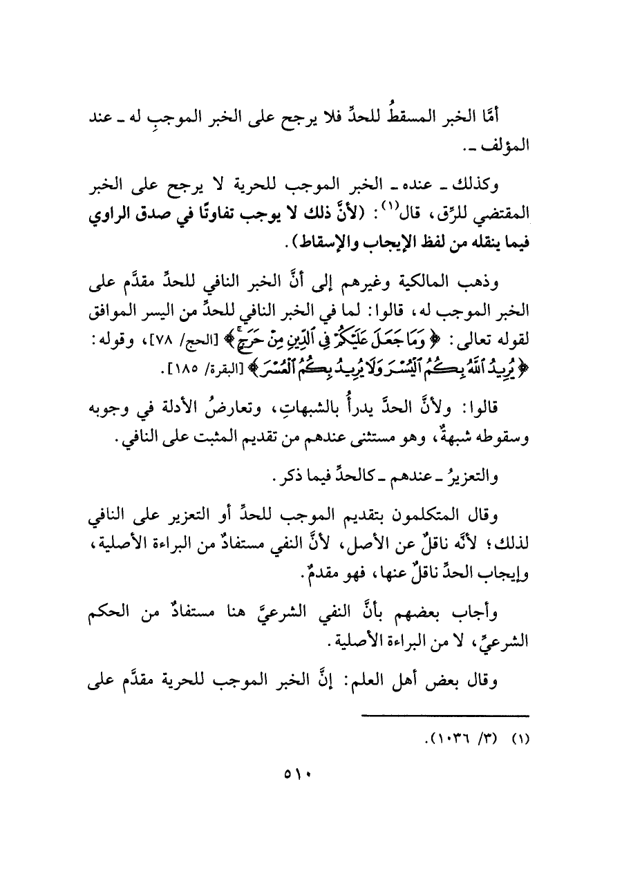 وذهب المالكية وغيرهم إلى أنَّ الخبر النافي للحدِّ مقدَّم على الخبر الموجب له، قالوا: لما في الخبر النافي للحدِّ من اليسر الموافق لقوله تعالى: {وَمَا جَعَلَ عَلَيْكُمْ فِي الدِّينِ مِنْ حَرَجٍ} [الحج/ ٧٨]، وقوله: {يُرِيدُ اللَّهُ بِكُمُ الْيُسْرَ وَلَا يُرِيدُ بِكُمُ الْعُسْرَ} [البقرة/ ١٨٥].