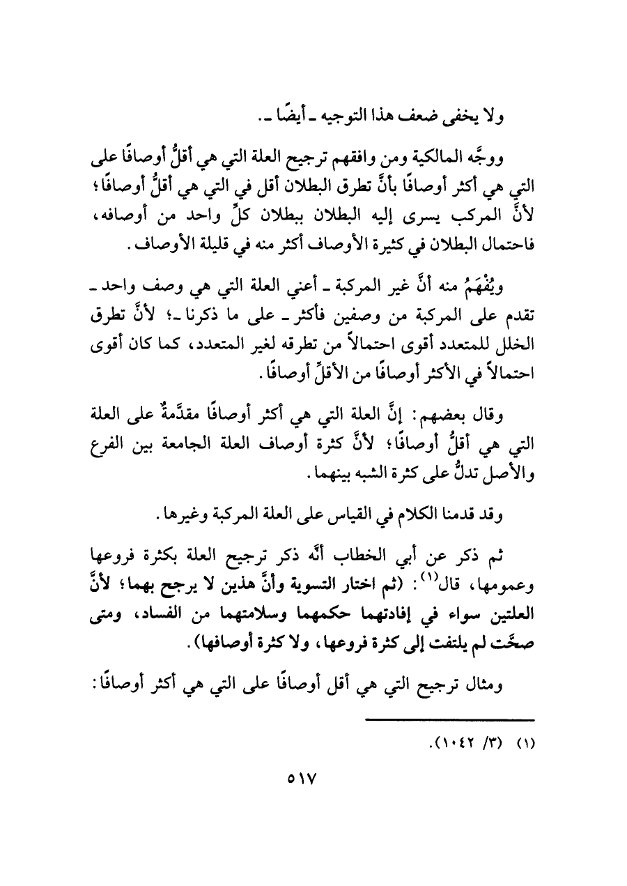 ووجَّه المالكية ومن وافقهم ترجيح العلة التي هي أقلُّ أوصافًا على التي هي أكثر أوصافًا بأنَّ تطرق البطلان أقل في التي هي أقلُّ أوصافًا؛ لأنَّ المركب يسرى إليه البطلان ببطلان كلِّ واحد من أوصافه، فاحتمال البطلان في كثيرة الأوصاف أكثر منه في قليلة الأوصاف.