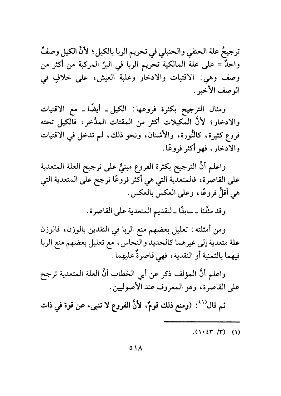 ومثال الترجيح بكثرة فروعها: الكيل -أيضًا- مع الاقتيات والادخار؟ لأنَّ المكيلات أكثر من المقتات المدَّخر، فالكيل تحته فروع كثيرة، كالنُّورة، والأشنان، ونحو ذلك، لم تدخل في الاقتيات والادخار، فهو أكثر فروعًا.