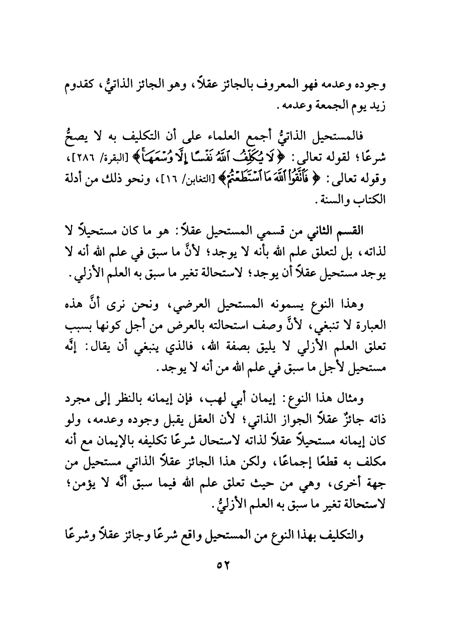 ومثال هذا النوع: إيمان أبي لهب، فإن إيمانه بالنظر إلى مجرد ذاته جائزٌ عقلًا الجواز الذاتي؛ لأن العقل يقبل وجوده وعدمه، ولو كان إيمانه مستحيلًا عقلًا لذاته لاستحال شرعًا تكليفه بالإيمان مع أنه مكلف به قطعًا إجماعًا، ولكن هذا الجائز عقلًا الذاتي مستحيل من جهة أخرى، وهي من حيث تعلق علم اللَّه فيما سبق أنَّه لا يؤمن؛ لاستحالة تغير ما سبق به العلم الأزليُّ.