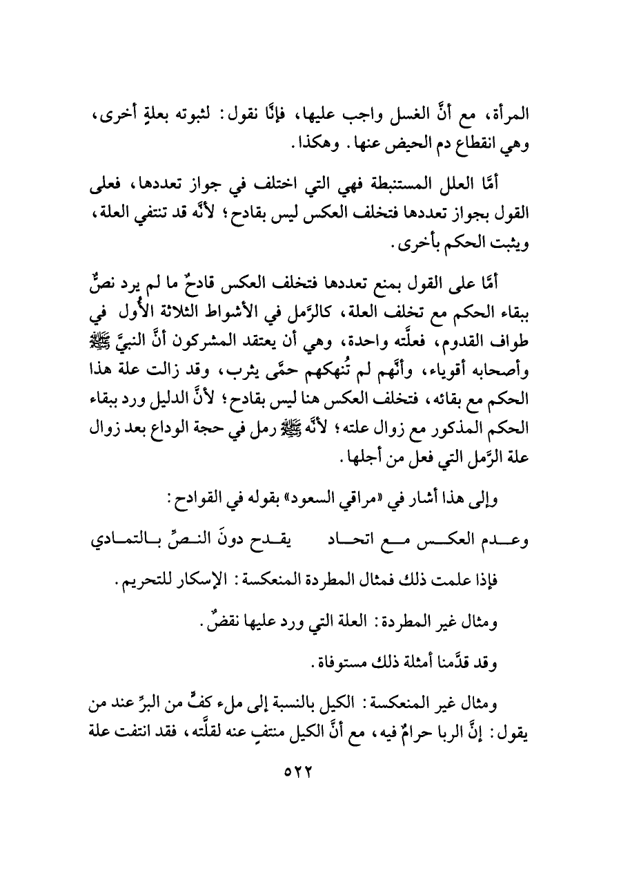 أمَّا على القول بمنع تعددها فتخلف العكس قادحٌ ما لم يرد نصٌّ ببقاء الحكم مع تخلف العلة، كالرَّمل في الأشواط الثلاثة الأُول في طواف القدوم، فعلَّته واحدة، وهي أن يعتقد المشركون أنَّ النبيَّ -صلى اللَّه عليه وسلم- وأصحابه أقوياء، وأنَّهم لم تُنهكهم حمَّى يثرب، وقد زالت علة هذا الحكم مع بقائه، فتخلف العكس هنا ليس بقادح؛ لأنَّ الدليل ورد ببقاء الحكم المذكور مع زوال علته؛ لأنَّه -صلى اللَّه عليه وسلم- رمل في حجة الوداع بعد زوال علة الرَّمل التي فعل من أجلها.