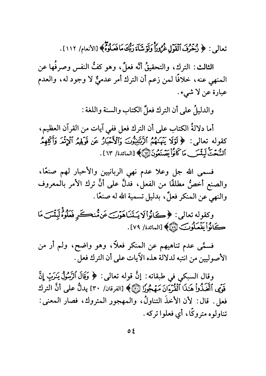 أما دلالةُ الكتاب على أن الترك فعل ففي آيات من القرآن العظيم، كقوله تعالى: {لَوْلَا يَنْهَاهُمُ الرَّبَّانِيُّونَ وَالْأَحْبَارُ عَنْ قَوْلِهِمُ الْإِثْمَ وَأَكْلِهِمُ السُّحْتَ لَبِئْسَ مَا كَانُوا يَصْنَعُونَ (٦٣)} [المائدة/ ٦٣].