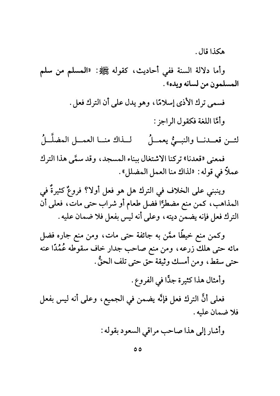 فسمى ترك الأذى إسلامًا، وهو يدل على أن الترك فعل.