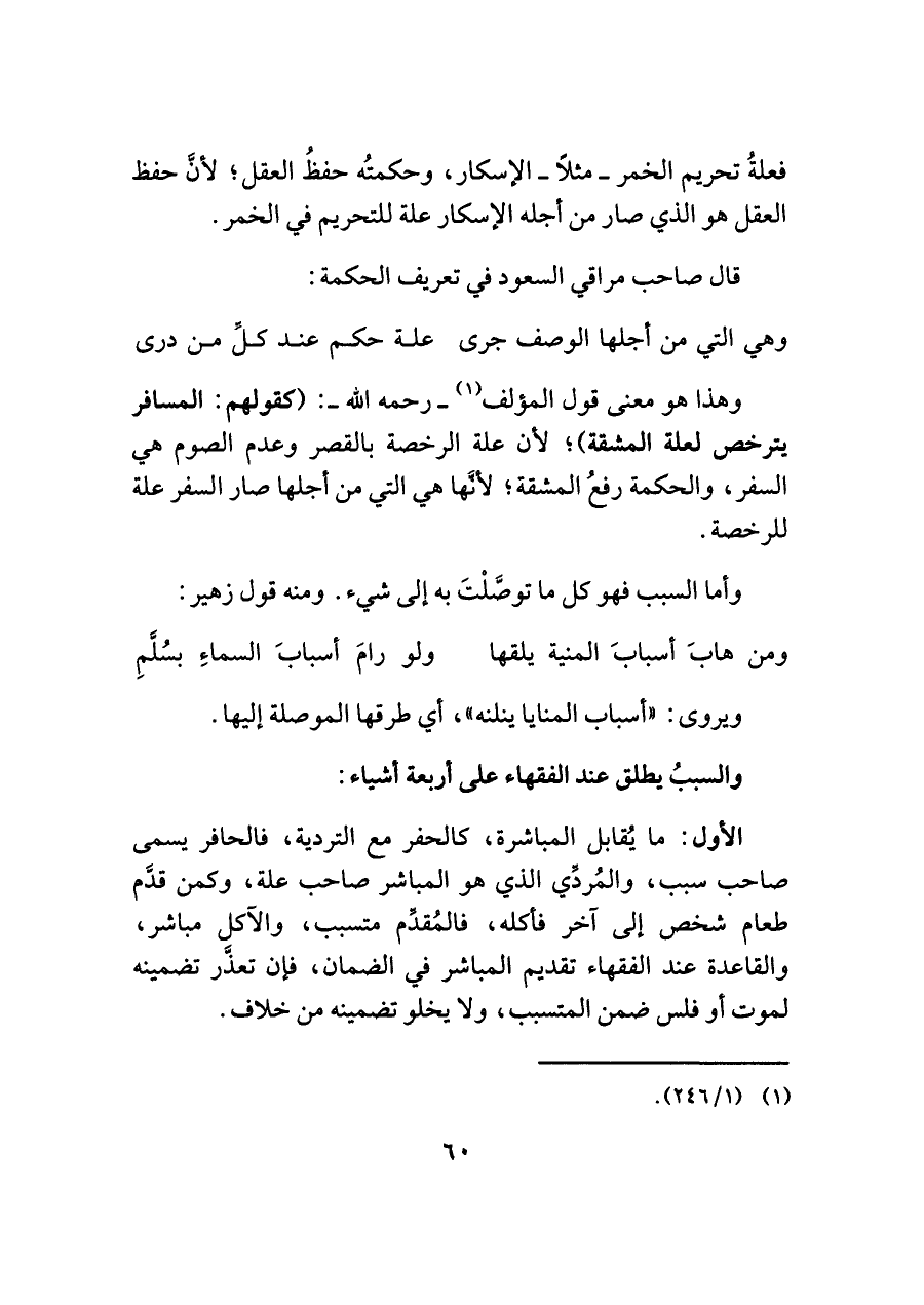 الأول: ما يُقابل المباشرة، كالحفر مع التردية، فالحافر يسمى صاحب سبب، والمُردِّي الذي هو المباشر صاحب علة، وكمن قدَّم طعام شخص إلى آخر فأكله، فالمُقدِّم متسبب، والآكل مباشر، والقاعدة عند الفقهاء تقديم المباشر في الضمان، فإن تعذَّر تضمينه لموت أو فلس ضمن المتسبب، ولا يخلو تضمينه من خلاف.