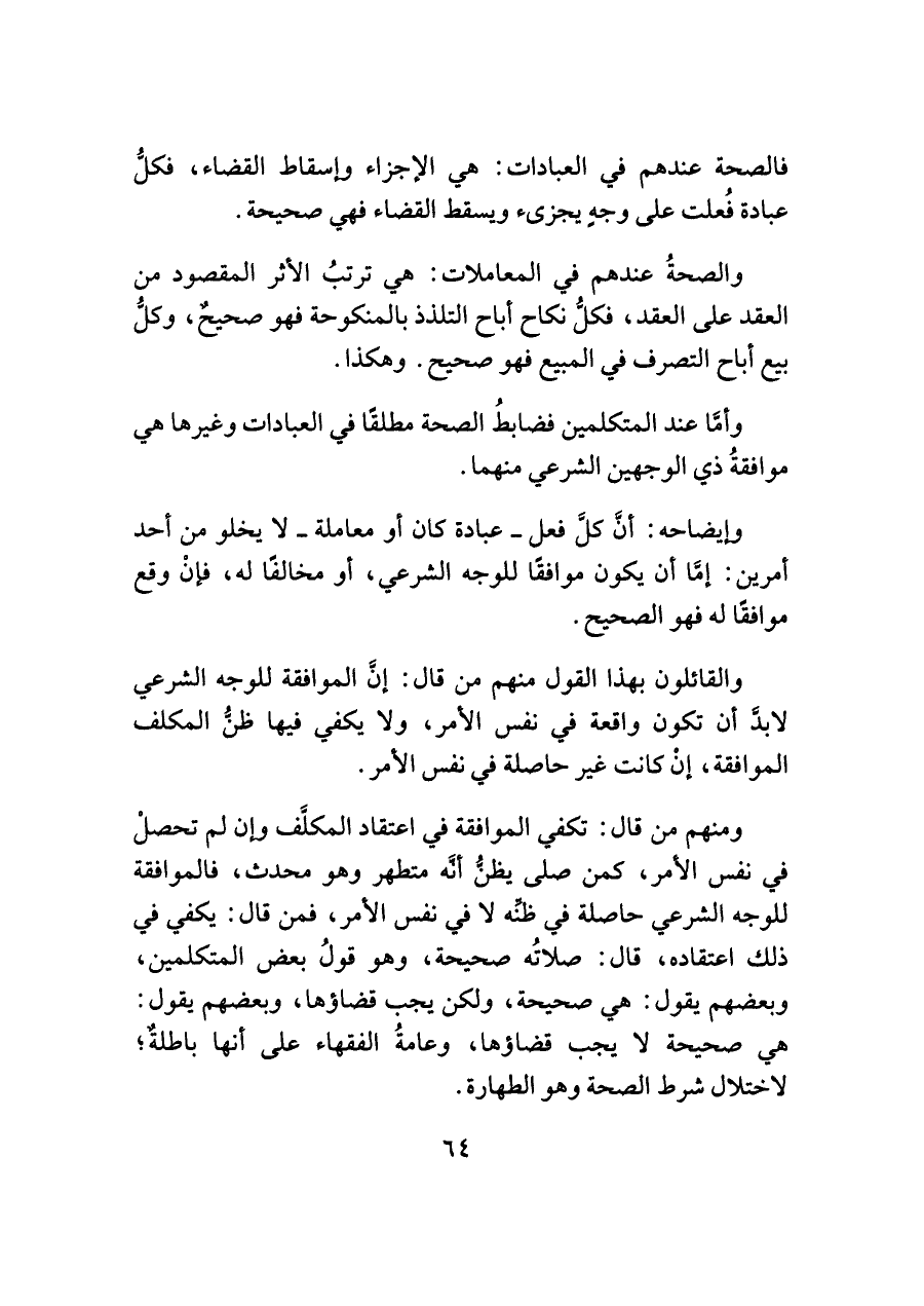 وأمَّا عند المتكلمين فضابطُ الصحة مطلقًا في العبادات وغيرها هي موافقةُ ذي الوجهين الشرعي منهما.