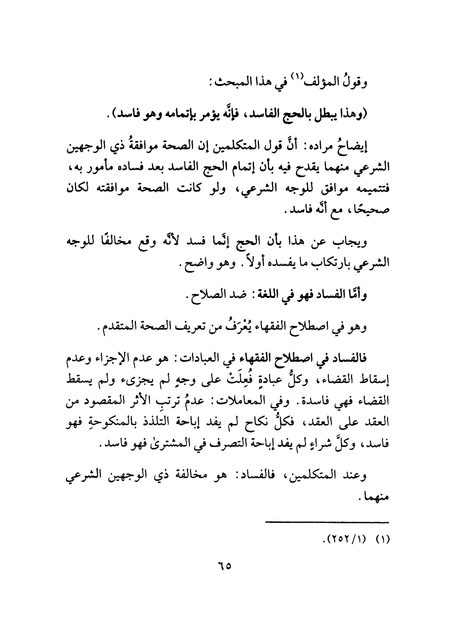 إيضاحُ مراده: أنَّ قول المتكلمين إن الصحة موافقةُ ذي الوجهين الشرعي منهما يقدح فيه بأن إتمام الحج الفاسد بعد فساده مأمور به، فتتميمه موافق للوجه الشرعي، ولو كانت الصحة موافقته لكان صحيحًا، مع أنَّه فاسد.