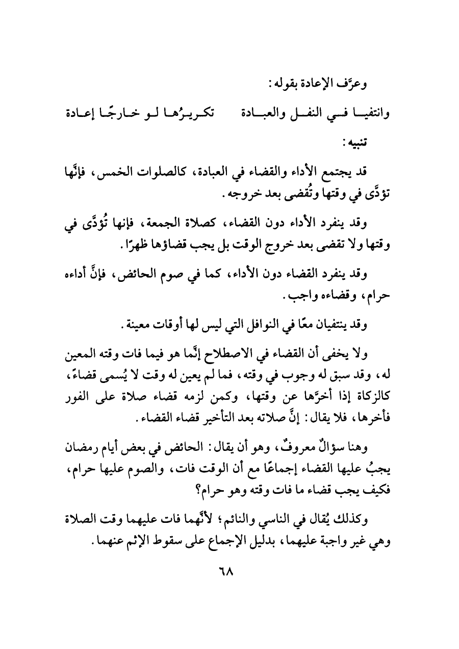وهنا سؤالٌ معروفٌ، وهو أن يقال: الحائض في بعض أيام رمضان يجبُ عليها القضاء إجماعًا مع أن الوقت فات، والصوم عليها حرام، فكيف يجب قضاء ما فات وقته وهو حرام؟