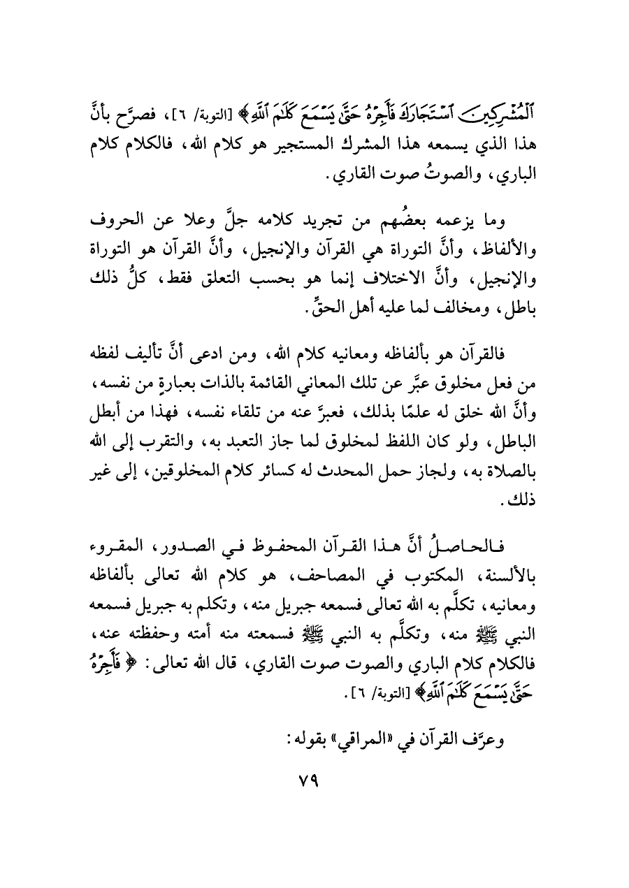 الْمُشْرِكِينَ اسْتَجَارَكَ فَأَجِرْهُ حَتَّى يَسْمَعَ كَلَامَ اللَّهِ} [التوبة/ ٦]، فصرَّح بأنَّ هذا الذي يسمعه هذا المشرك المستجير هو كلام اللَّه، فالكلام كلام الباري، والصوتُ صوت القاري.
