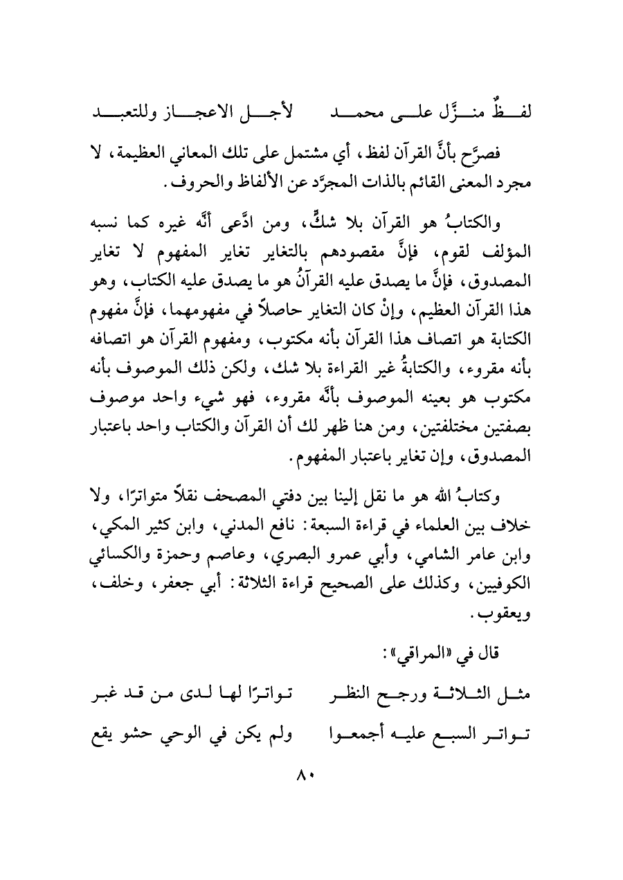 لفظٌ منزَّل على محمد ... لأجل الاعجاز وللتعبد