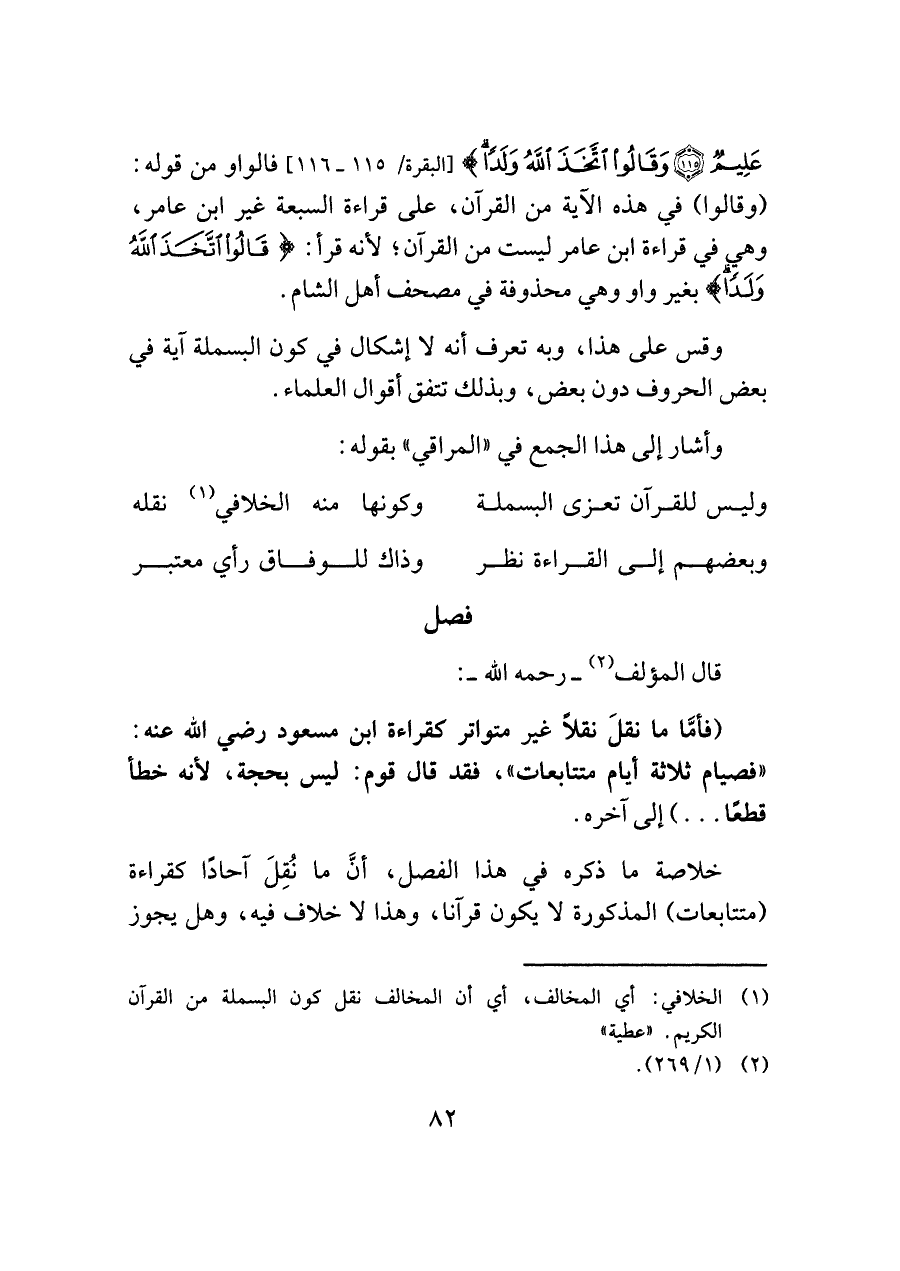 عَلِيمٌ (١١٥) وَقَالُوا اتَّخَذَ اللَّهُ وَلَدًا} [البقرة/ ١١٥ - ١١٦] فالواو من قوله: (وقالوا) في هذه الآية من القرآن، على قراءة السبعة غير ابن عامر، وهي في قراءة ابن عامر ليست من القرآن؛ لأنه قرأ: {قَالُوا اتَّخَذَ اللَّهُ وَلَدًا} بغير واو وهي محذوفة في مصحف أهل الشام.