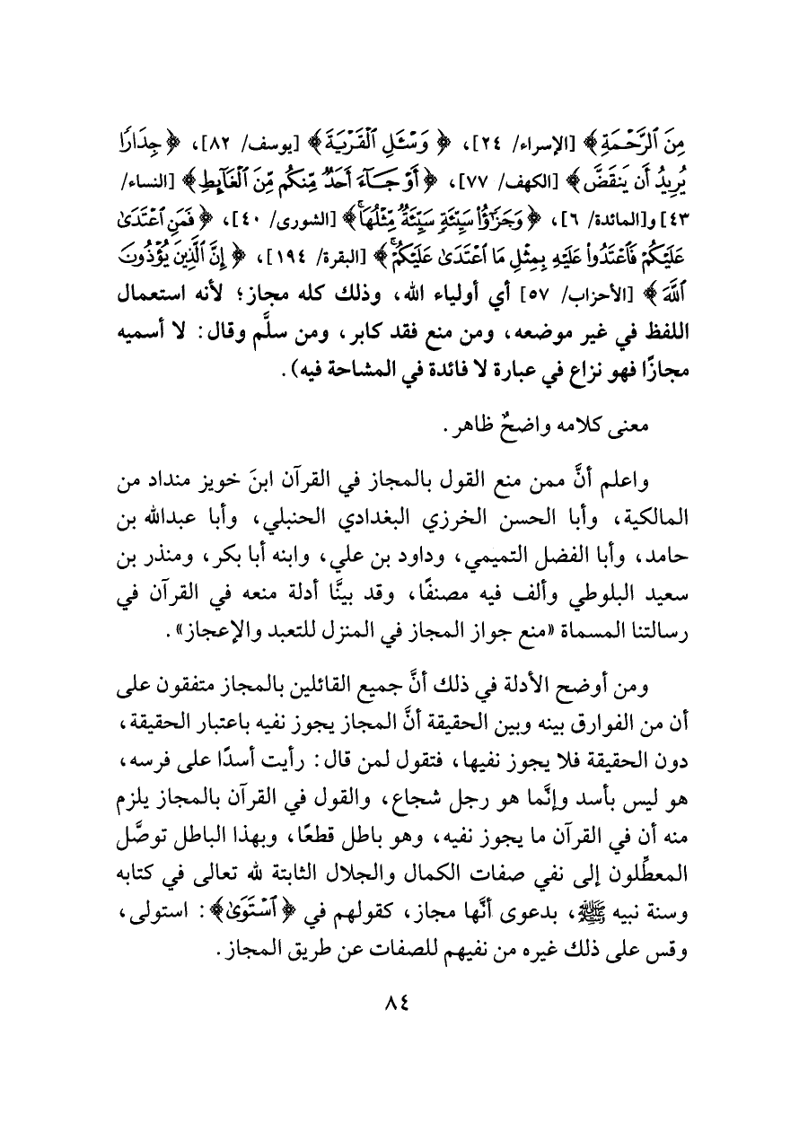واعلم أنَّ ممن منع القول بالمجاز في القرآن ابنُ خويز منداد من المالكية، وأبا الحسن الخرزي البغدادي الحنبلي، وأبا عبد اللَّه بن حامد، وأبا الفضل التميمي، وداود بن علي، وابنه أبا بكر، ومنذر بن سعيد البلوطي وألف فيه مصنفًا، وقد بينَّا أدلة منعه في القرآن في رسالتنا المسماة "منع جواز المجاز في المنزل للتعبد والإعجاز".