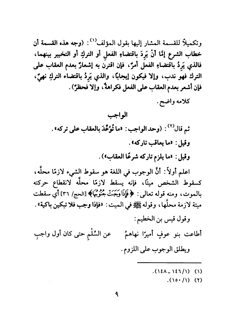 اعلم أولًا: أنَّ الوجوب في اللغة هو سقوط الشيء لازمًا محلَّه، كسقوط الشخص ميتًا، فإنه يسقط لازمًا محلَّه لانقطاع حركته بالموت، ومنه قوله تعالى: {فَإِذَا وَجَبَتْ جُنُوبُهَا} [الحج/ ٣٦] أي سقطت ميتة لازمة محلَّها، وقوله -صلى اللَّه عليه وسلم- في الميت: "فإذا وجب فلا تبكين باكية".
