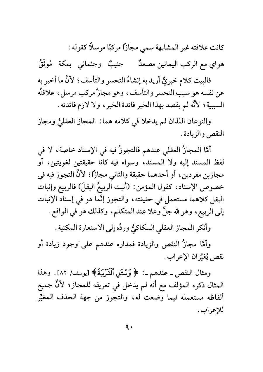 ومثال النقص -عندهم-: {وَاسْأَلِ الْقَرْيَةَ} [يوسف/ ٨٢]. وهذا المثال ذكره المؤلف مع أنه لم يدخل في تعريفه للمجاز؛ لأنَّ جميع ألفاظه مستعملة فيما وضعت له، والتجوز من جهة الحذف المغيِّر للإعراب.