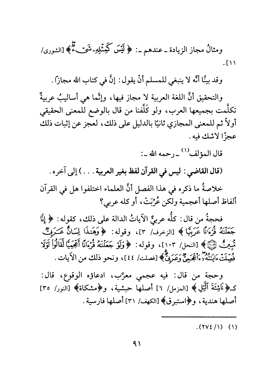 وقد بينَّا أنَّه لا ينبغي للمسلم أنْ يقول: إنَّ في كتاب اللَّه مجازًا.