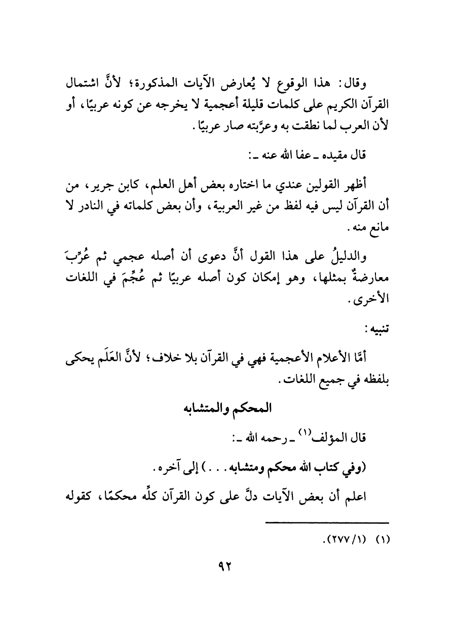 وقال: هذا الوقوع لا يُعارض الآيات المذكورة؛ لأنَّ اشتمال القرآن الكريم على كلمات قليلة أعجمية لا يخرجه عن كونه عربيًا، أو لأن العرب لما نطقت به وعرَّبته صار عربيًا.