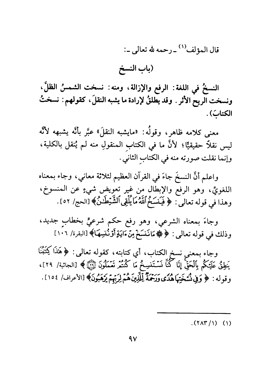 النسخُ في اللغة: الرفع والإزالة، ومنه: نسخت الشمسُ الظلَّ، ونسخت الريح الأثر. وقد يطلقُ لإرادة ما يشبه النقلَ، كقولهم: نسختُ الكتابَ).