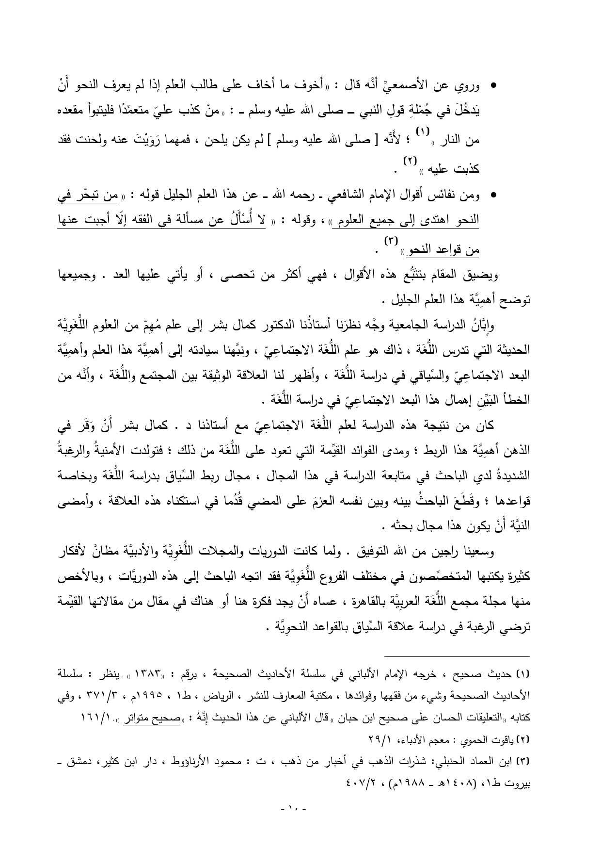 وسعينا راجين من الله التوفيق. ولما كانت الدوريات والمجلات اللُّغَوِيَّة والأدبيَّة مظانَّ لأفكار كثيرة يكتبها المتخصِّصون في مختلف الفروع اللُّغَوِيَّة فقد اتجه الباحث إلى هذه الدوريَّات، وبالأخص منها مجلة مجمع اللُّغَة العربِيَّة بالقاهرة، عساه أَنْ يجد فكرة هنا أو هناك في مقال من مقالاتها القيِّمة ترضي الرغبة في دراسة علاقة السِّياق بالقواعد النحوِيَّة.