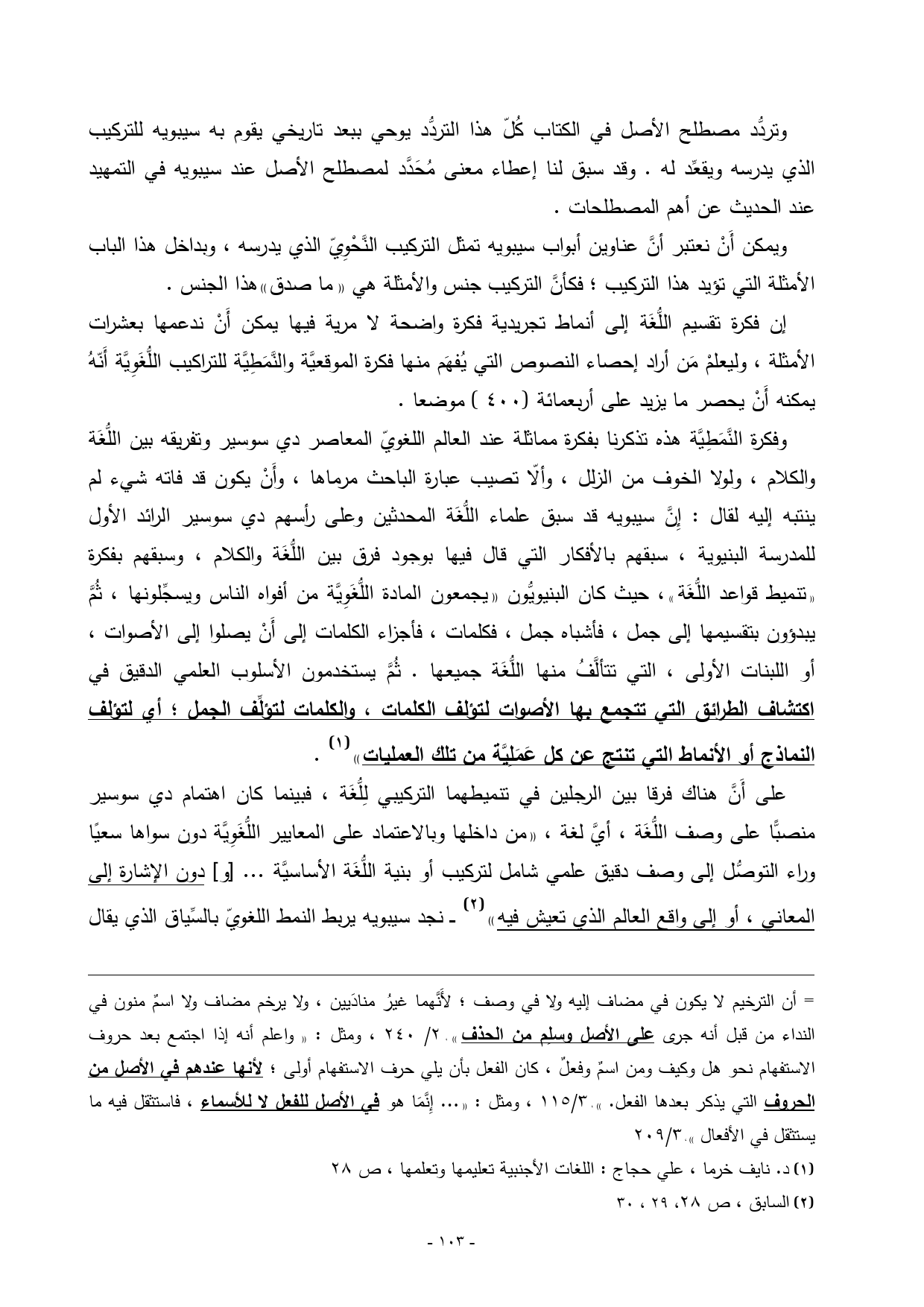 على أَنَّ هناك فرقا بين الرجلين في تنميطهما التركيبي لِلُّغَة، فبينما كان اهتمام دي سوسير منصبًّا على وصف اللُّغَة، أيَّ لغة، «من داخلها وبالاعتماد على المعايير اللُّغَوِيَّة دون سواها سعيًا وراء التوصُّل إلى وصف دقيق علمي شامل لتركيب أو بنية اللُّغَة الأساسيَّة ... [و] دون الإشارة إلى المعاني، أو إلى واقع العالم الذي تعيش فيه») (¬2) ـــ نجد سيبويه يربط النمط اللغويّ بالسِّياق الذي يقال