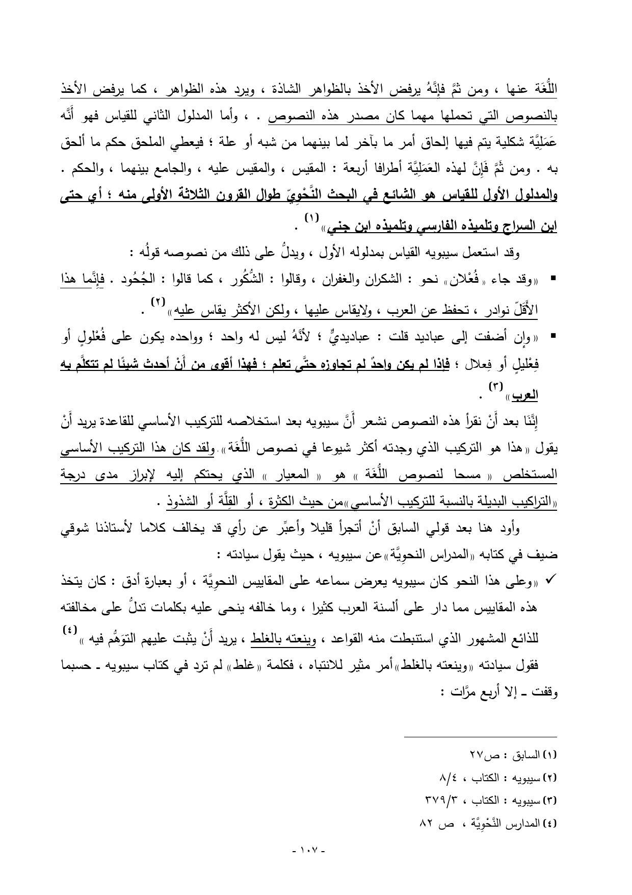 • «وعلى هذا النحو كان سيبويه يعرض سماعه على المقاييس النحوِيَّة، أو بعبارة أدق: كان يتخذ هذه المقاييس مما دار على ألسنة العرب كثيرا، وما خالفه ينحى عليه بكلمات تدلُّ على مخالفته للذائع المشهور الذي استنبطت منه القواعد، وينعته بالغلط، يريد أَنْ يثبت عليهم التوَهُّم فيه» (¬4)