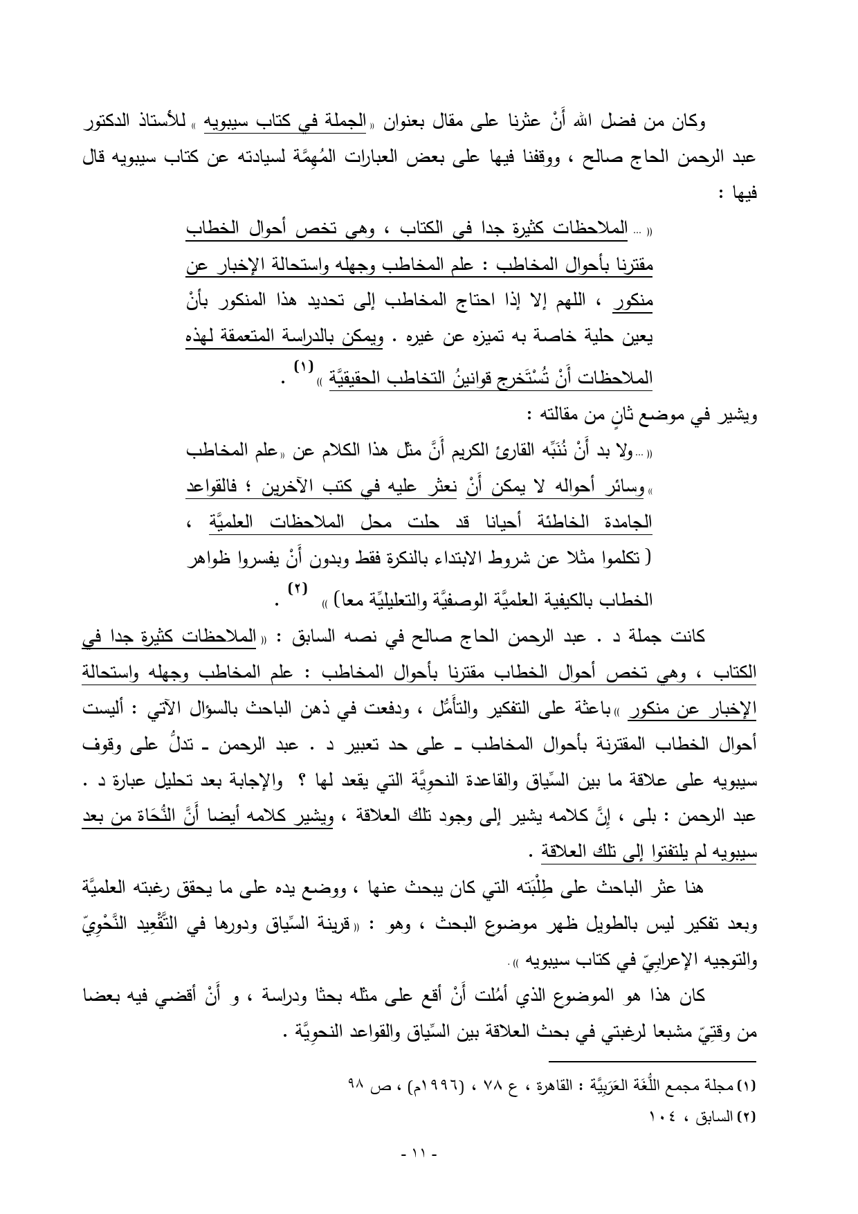 وكان من فضل الله أَنْ عثرنا على مقال بعنوان ((الجملة في كتاب سيبويه)) للأستاذ الدكتور عبد الرحمن الحاج صالح، ووقفنا فيها على بعض العبارات المُهِمَّة لسيادته عن كتاب سيبويه قال