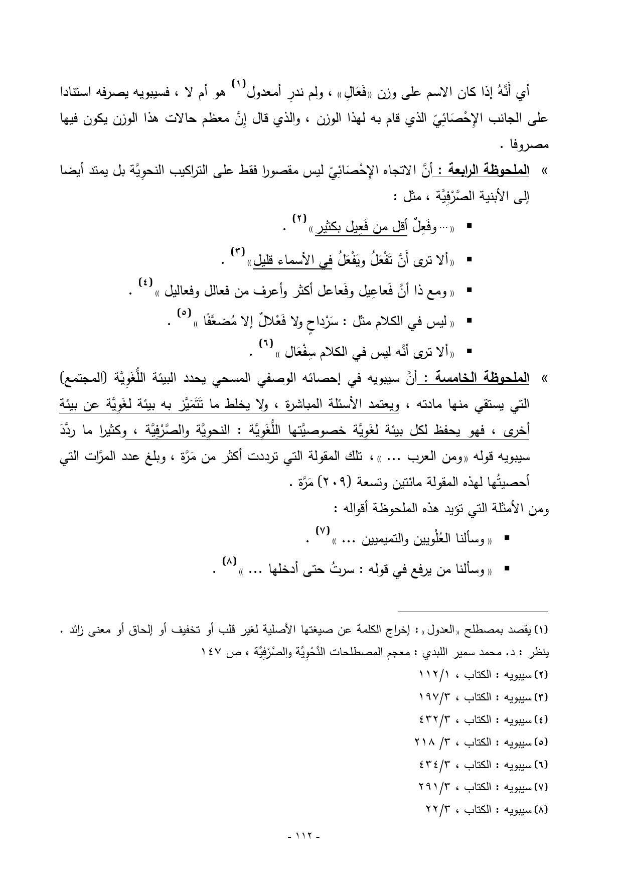 » الملحوظة الخامسة: أنَّ سيبويه في إحصائه الوصفي المسحي يحدد البيئة اللُّغَوِيَّة) المجتمع (التي يستقي منها مادته، ويعتمد الأسئلة المباشرة، ولا يخلط ما تَتَمَيَّز به بيئة لغَوِيَّة عن بيئة أخرى، فهو يحفظ لكل بيئة لغَوِيَّة خصوصيَّتها اللُّغَوِيَّة: النحوِيَّة والصَّرْفِيَّة، وكثيرا ما ردَّدَ سيبويه قوله «ومن العرب ... »، تلك المقولة التي ترددت أكثر من مَرَّة، وبلغ عدد المرَّات التي أحصيتُها لهذه المقولة مائتين وتسعة) 209 (مَرَّة.