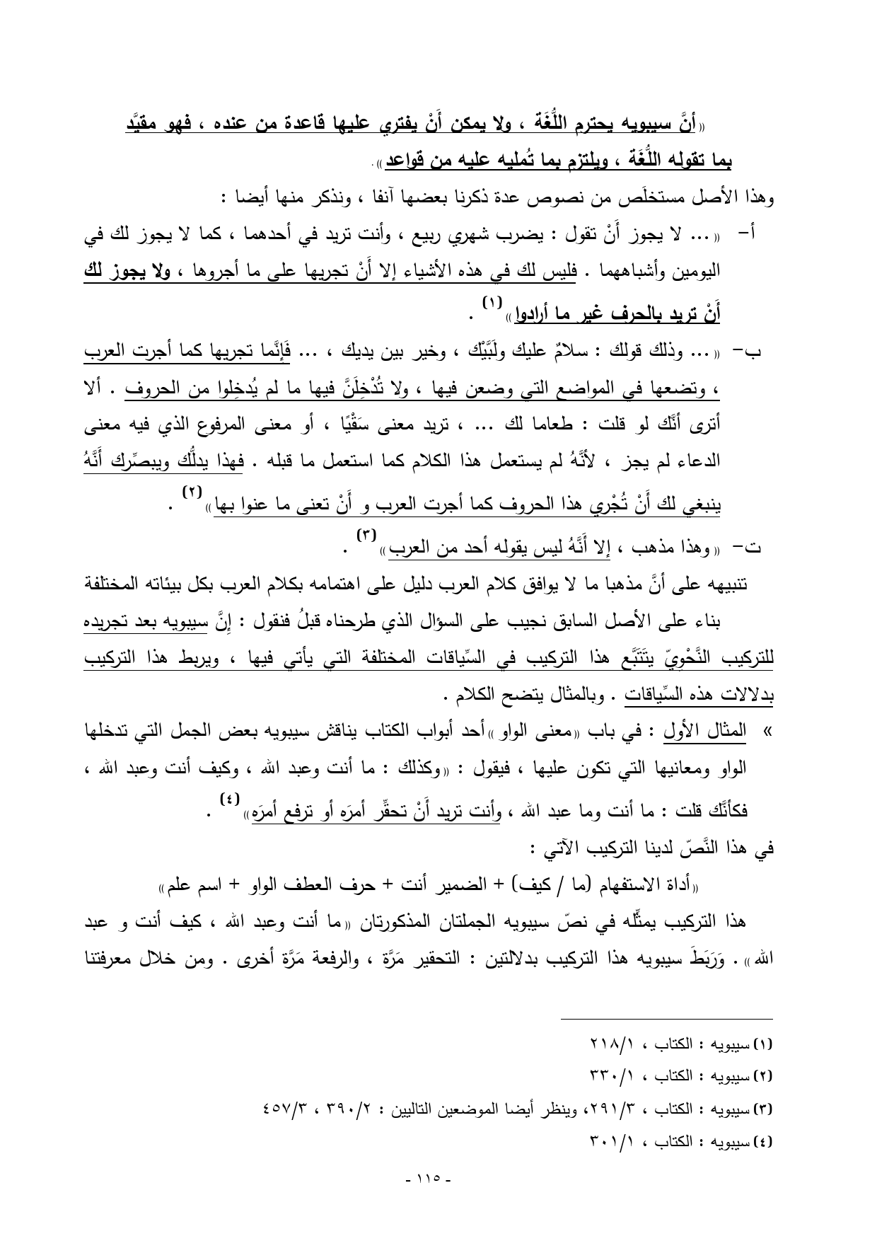بناء على الأصل السابق نجيب على السؤال الذي طرحناه قبلُ فنقول: إِنَّ سيبويه بعد تجريده للتركيب النَّحْوِيّ يتَتَبَّع هذا التركيب في السِّياقات المختلفة التي يأتي فيها، ويربط هذا التركيب بدلالات هذه السِّياقات. وبالمثال يتضح الكلام.