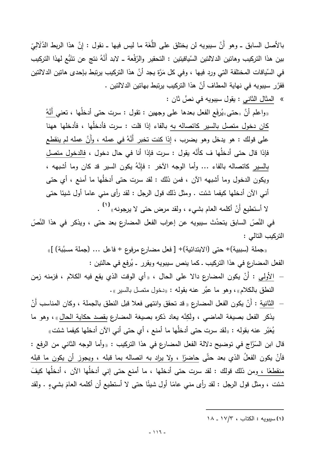 في النَّصّ السابق يتحدَّث سيبويه عن إعراب الفعل المضارع بعد حتى، ويذكر في هذا النَّصّ التركيب التالي: