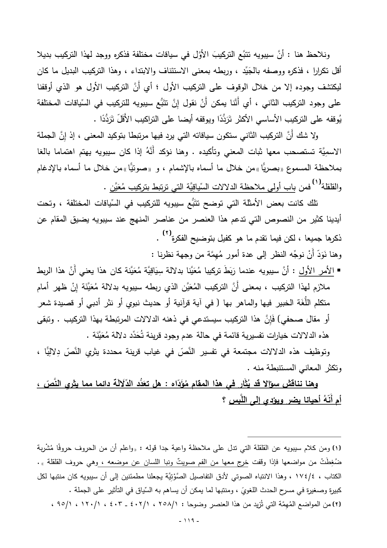 (¬1) ومن كلام سيبويه عن القلقلة التي تدل على ملاحظة واعية جدا قوله: ((واعلم أن من الحروف حروفًا مُشْربة ضُغِطَتْ من مواضعها فإذا وقفت خرج معها من الفم صويتٌ ونبا اللسان عن موضعه، وهي حروف القلقلة)). الكتاب، 4/ 174، وهذا الانتباه الصوتي لأدق التفاصيل الصَّوْتِيَّة يجعلنا مطمئنين إلى أن سيبويه كان منتبها لكل كبيرة وصغيرة في مسرح الحدث اللغويّ، ومنتبها لما يمكن أن يساهم به السِّياق في التأثير على الجملة.