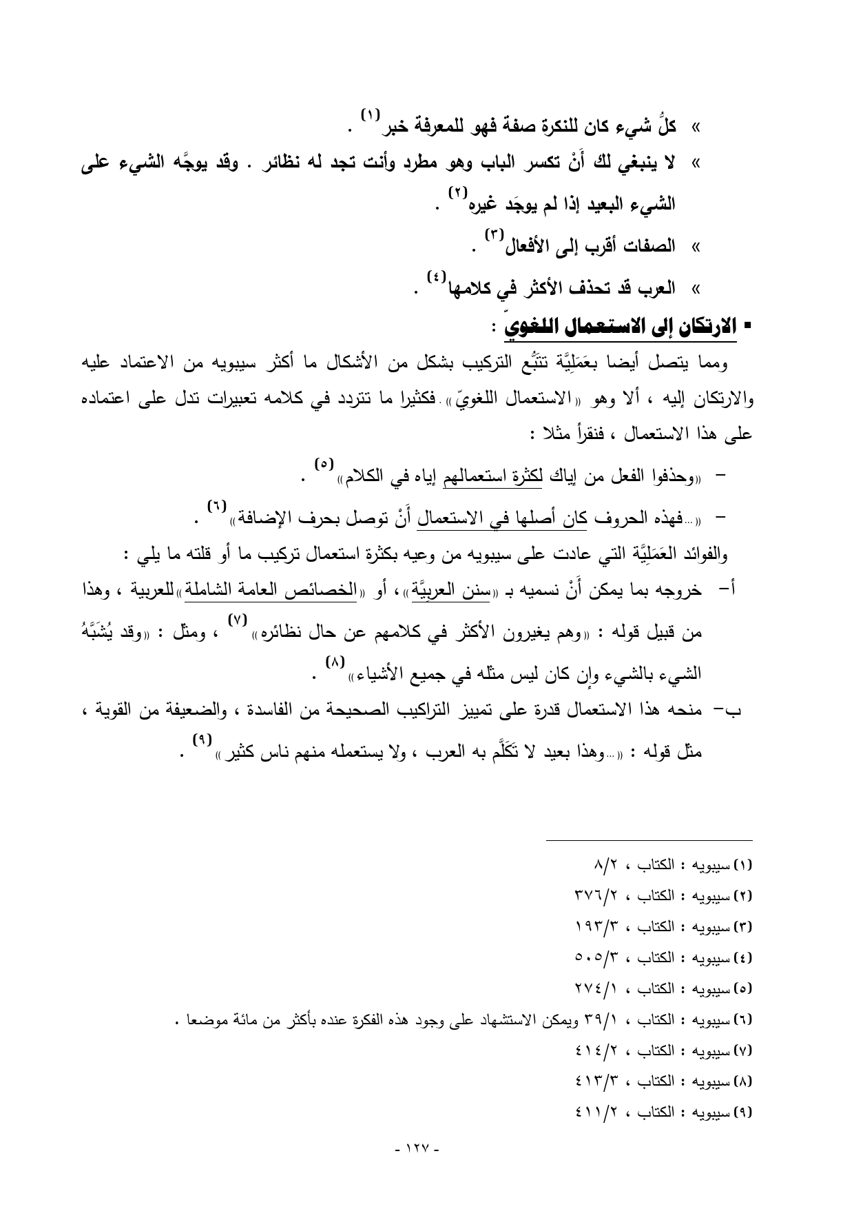ب منحه هذا الاستعمال قدرة على تمييز التراكيب الصحيحة من الفاسدة، والضعيفة من القوية، مثل قوله: « ... وهذا بعيد لا تَكَلَّم به العرب، ولا يستعمله منهم ناس كثير») (¬9).