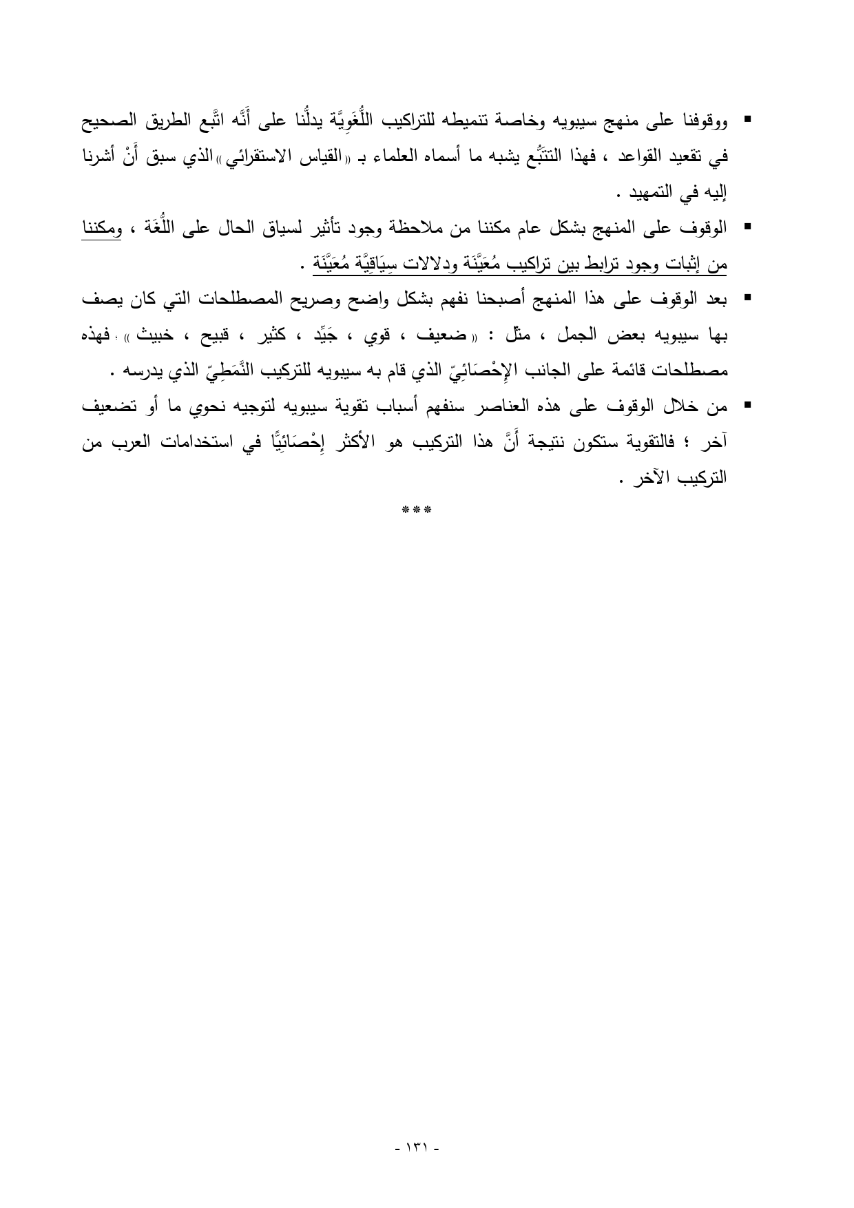 • من خلال الوقوف على هذه العناصر سنفهم أسباب تقوية سيبويه لتوجيه نحوي ما أو تضعيف آخر؛ فالتقوية ستكون نتيجة أَنَّ هذا التركيب هو الأكثر إِحْصَائِيًّا في استخدامات العرب من التركيب الآخر.