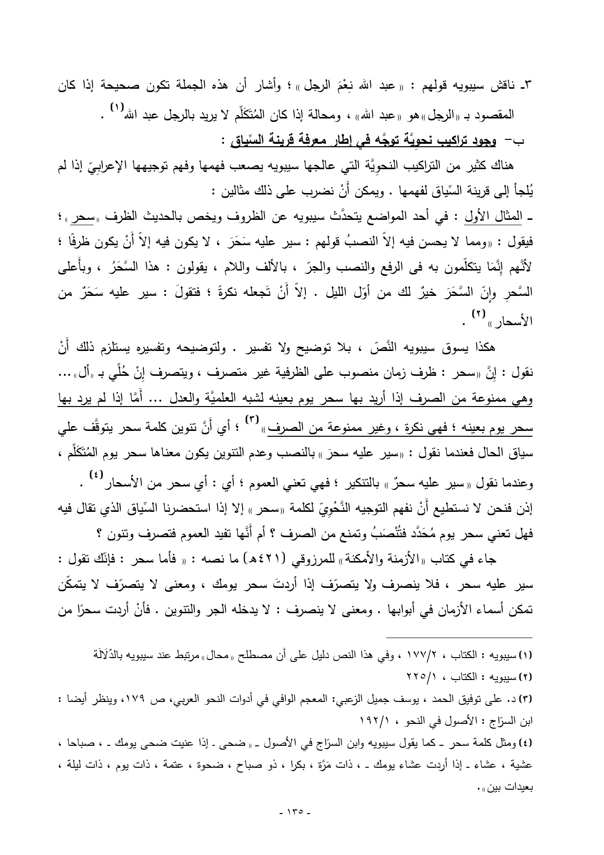 ــــ المثال الأول: في أحد المواضع يتحدَّث سيبويه عن الظروف ويخص بالحديث الظرف ((سحر))؛ فيقول: «ومما لا يحسن فيه إلاّ النصبُ قولهم: سير عليه سَحَرَ، لا يكون فيه إلاّ أَنْ يكون ظرفًا؛ لأنَّهم إِنَّمَا يتكلّمون به فى الرفع والنصب والجرّ، بالألف واللام، يقولون: هذا السَّحَرُ، وبأَعلى السَّحرِ وإنّ السَّحَرَ خيرٌ لك من أوّل الليل. إلاّ أَنْ تَجعله نكرةً؛ فتقولَ: سير عليه سَحَرٌ من الأسحار») (¬2).