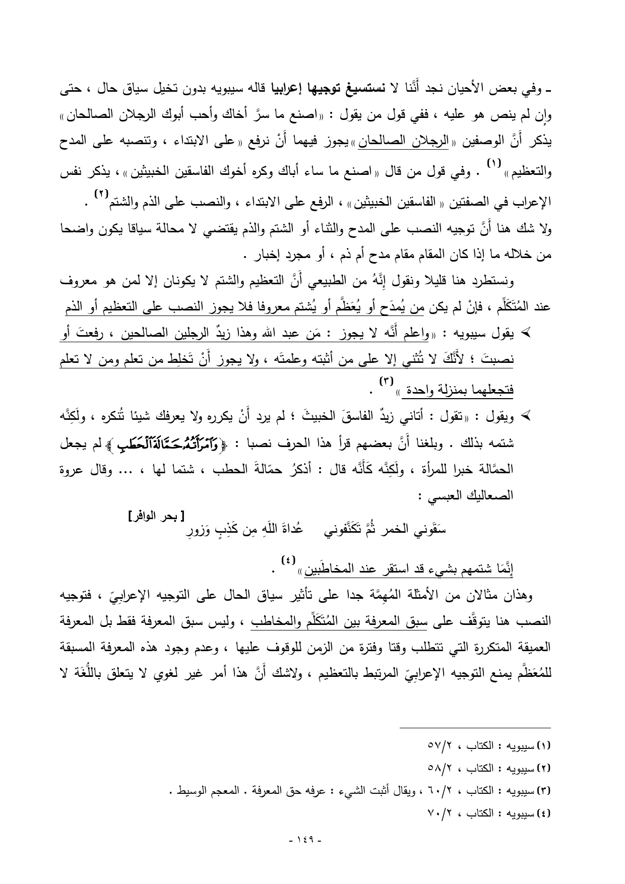 ــــ وفي بعض الأحيان نجد أَنَّنا لا نستسيغ توجيها إعرابيا قاله سيبويه بدون تخيل سياق حال، حتى وإن لم ينص هو عليه، ففي قول من يقول: «اصنع ما سرَّ أخاك وأحب أبوك الرجلان الصالحان» يذكر أَنَّ الوصفين «الرجلان الصالحان» يجوز فيهما أَنْ نرفع «على الابتداء، وتنصبه على المدح والتعظيم») (¬1). وفي قول من قال «اصنع ما ساء أباك وكره أخوك الفاسقين الخبيثين»، يذكر نفس الإعراب في الصفتين «الفاسقين الخبيثين»، الرفع على الابتداء، والنصب على الذم والشتم) (¬2).