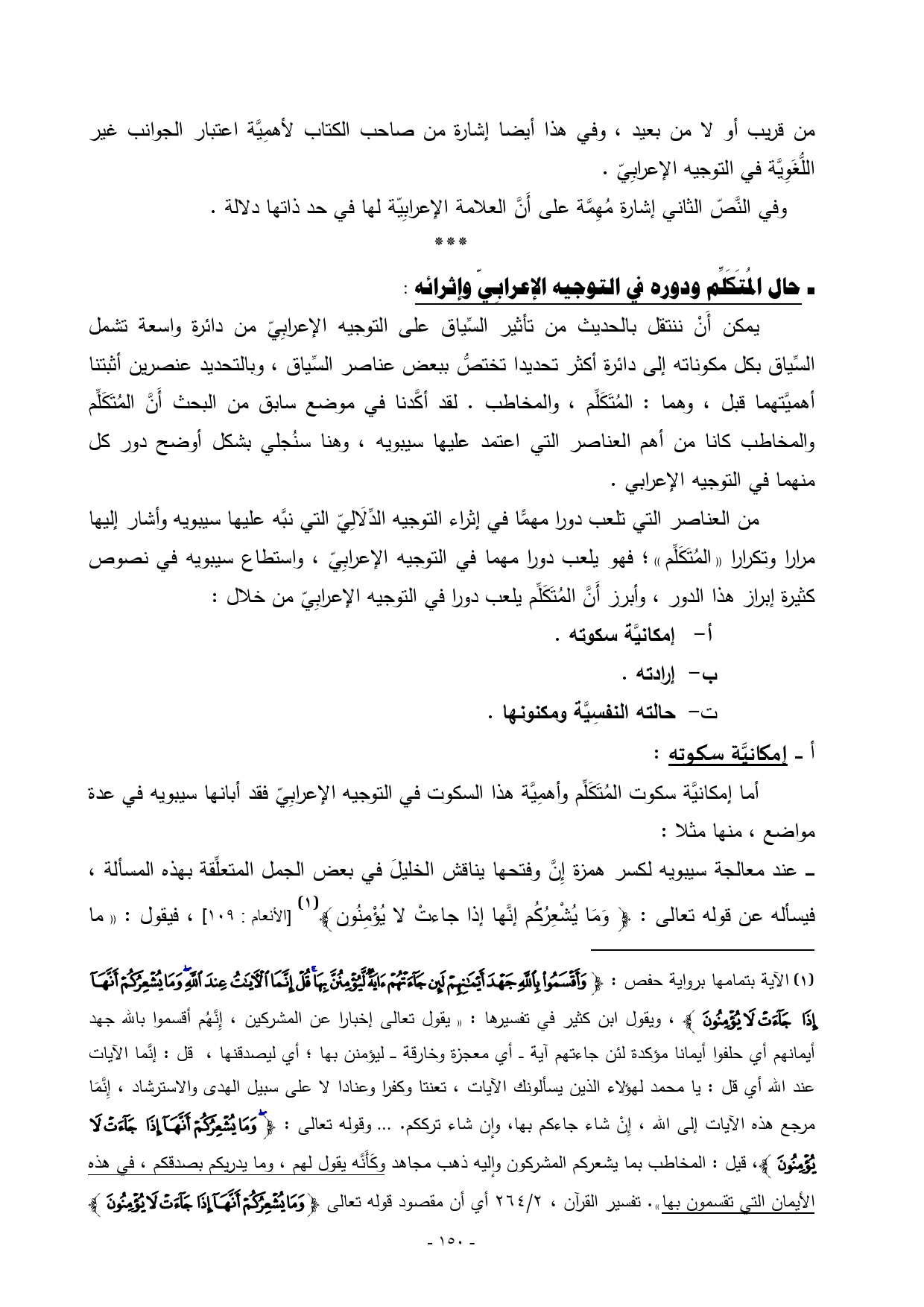 أما إمكانيَّة سكوت المُتَكَلِّم وأهمِيَّة هذا السكوت في التوجيه الإعرابِيّ فقد أبانها سيبويه في عدة مواضع، منها مثلا: