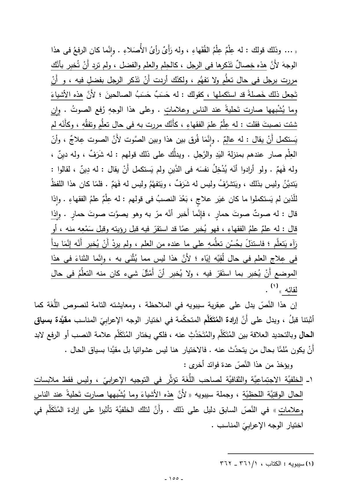 1 ــــ الخلفيَّة الاجتِماعِيَّة والثقافيَّة لصاحب اللُّغَة تؤثِّر في التوجيه الإعرابِيّ، وليس فقط ملابسات الحال الوقتِيَّة اللحظِيّة، وجملة سيبويه ((لأَنَّ هذه الأشياءَ وما يُشْبِهها صارت تَحليةً عند الناس وعلاماتٍ)) في النَّصّ السابق دليل على ذلك. وأَنَّ لتلك الخلفيَّة تأثيرا على إرادة المُتَكَلِّم في اختيار الوجه الإعرابِيّ المناسب.
