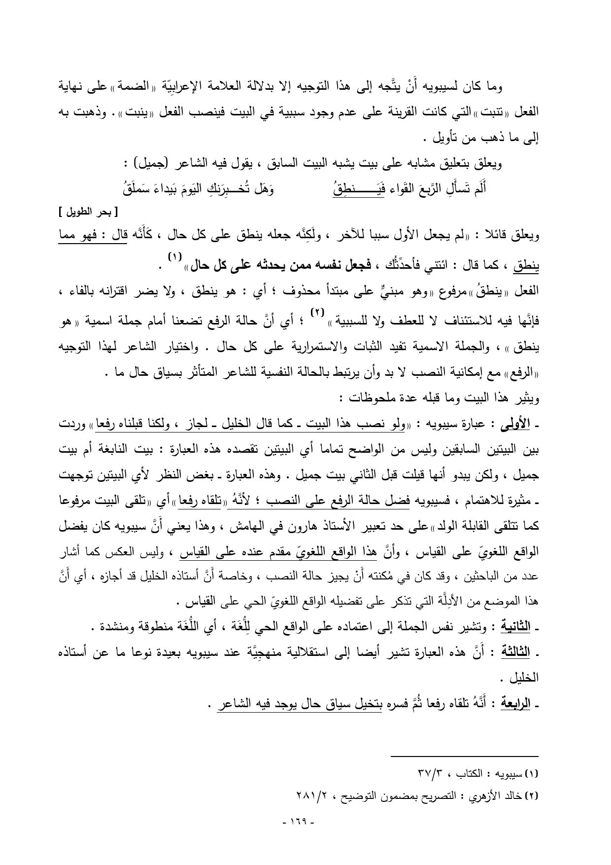 ـــ الأولى: عبارة سيبويه: «ولو نصب هذا البيت ـــ كما قال الخليل ــــ لجاز، ولكنا قبلناه رفعا» وردت بين البيتين السابقين وليس من الواضح تماما أي البيتين تقصده هذه العبارة: بيت النابغة أم بيت جميل، ولكن يبدو أنها قيلت قبل الثاني بيت جميل. وهذه العبارة ـــ بغض النظر لأي البيتين توجهت ـــ مثيرة للاهتمام، فسيبويه فضل حالة الرفع على النصب؛ لأنَّهُ «تلقاه رفعا» أي «تلقى البيت مرفوعا كما تتلقى القابلة الولد» على حد تعبير الأستاذ هارون في الهامش، وهذا يعني أَنَّ سيبويه كان يفضل الواقع اللغويّ على القياس، وأنَّ هذا الواقع اللغويّ مقدم عنده على القياس، وليس العكس كما أشار عدد من الباحثين، وقد كان في مُكنته أَنْ يجيز حالة النصب، وخاصة أَنَّ أستاذه الخليل قد أجازه، أي أَنَّ هذا الموضع من الأدِلَّة التي تذكر على تفضيله الواقع اللغويّ الحي على القياس.