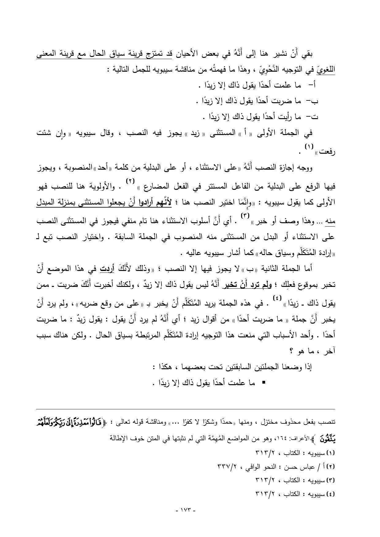 أما الجملة الثانية «ب» لا يجوز فيها إلا النصب؛ «وذلك لأَنَّكَ أردت في هذا الموضع أَنْ تخبر بموقوع فعلِك؛ ولم ترد أَنْ تخبر أَنَّهُ ليس يقول ذاك إلا زيدٌ، ولكنك أخبرت أَنَّكَ ضربت ـــ ممن يقول ذاك ـــ زيدًا») (¬4). في هذه الجملة يريد المُتَكَلِّم أَنْ يخبر بـ «على من وقع ضربه»، ولم يرد أَنْ يخبر أَنَّ جملة «ما ضربت أحدًا» من أقوال زيد؛ أي أَنَّهُ لم يرد أَنْ يقول: يقول زيدٌ: ما ضربت أحدًا. وأحد الأسباب التي منعت هذا التوجيه إرادة المُتَكَلِّم المرتبطة بسياق الحال. ولكن هناك سبب آخر، ما هو؟