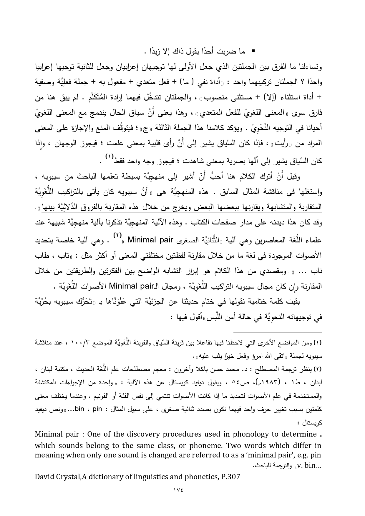 وقبل أَنْ أترك الكلام هنا أحبُّ أَنْ أشير إلى منهجِيَّة بسيطة تعلمها الباحث من سيبويه، واستغلها في مناقشة المثال السابق. هذه المنهجِيَّة هي «أَنَّ سيبويه كان يأتي بالتراكيب اللُّغَوِيَّة المتقاربة والمتشابهة ويقارنها ببعضها البعض ويخرج من خلال هذه المقارنة بالفروق الدِّلالِيَّة بينها»، وقد كان هذا ديدنه على مدار صفحات الكتاب. وهذه الآلية المنهجِيَّة تذكرنا بآلية منهجِيَّة شبيهة عند علماء اللُّغَة المعاصرين وهي آلية ((الثُّنائِيَّة الصغرى Minimal pair») (¬2) . وهي آلية خاصة بتحديد الأصوات الموجودة في لغة ما من خلال مقارنة لفظتين مختلفتي المعنى أو أكثر مثل: «تاب، طاب ناب ... ». ومقصدي من هذا الكلام هو إبراز التشابه الواضح بين الفكرتين والطريقتين من خلال المقارنة وإن كان مجال سيبويه التراكيب اللُّغَوِيَّة، ومجال الـ Minimal pair الأصوات اللُّغَوِيَّة.