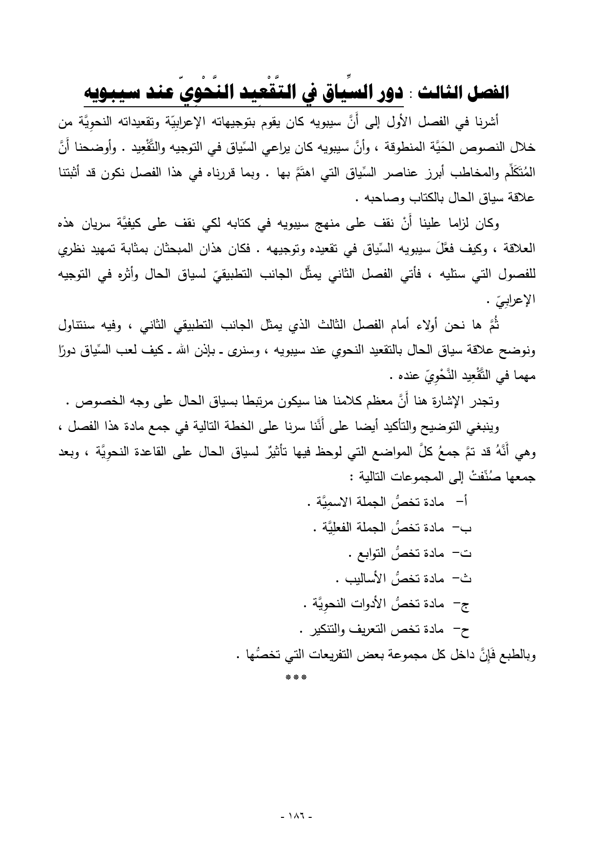 ثُمَّ ها نحن أولاء أمام الفصل الثالث الذي يمثل الجانب التطبيقي الثاني، وفيه سنتناول ونوضح علاقة سياق الحال بالتقعيد النحوي عند سيبويه، وسنرى ـــ بإذن الله ـــ كيف لعب السِّياق دورًا مهما في التَّقْعِيد النَّحْوِيّ عنده.