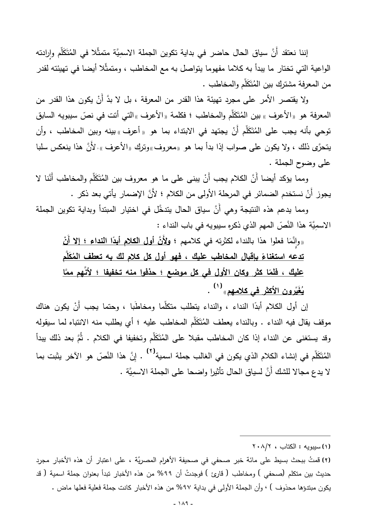 إن أول الكلام أبدًا النداء، والنداء يتطلب متكلِّما ومخاطَبا، وحتما يجب أَنْ يكون هناك موقف يقال فيه النداء. وبالنداء يعطف المُتَكَلِّم المخاطب عليه؛ أي يطلب منه الانتباه لما سيقوله وقد يستغنى عن النداء إذا كان المخاطب مقبلا على المُتَكَلِّم وتخفيفا في الكلام. ثُمَّ بعد ذلك يبدأ المُتَكَلِّم في إنشاء الكلام الذي يكون في الغالب جملة اسمية) (¬2). إِنَّ هذا النَّصّ هو الآخر يثبت بما لا يدع مجالا للشك أَنَّ لسياق الحال تأثيرا واضحا على الجملة الاسمِيَّة.