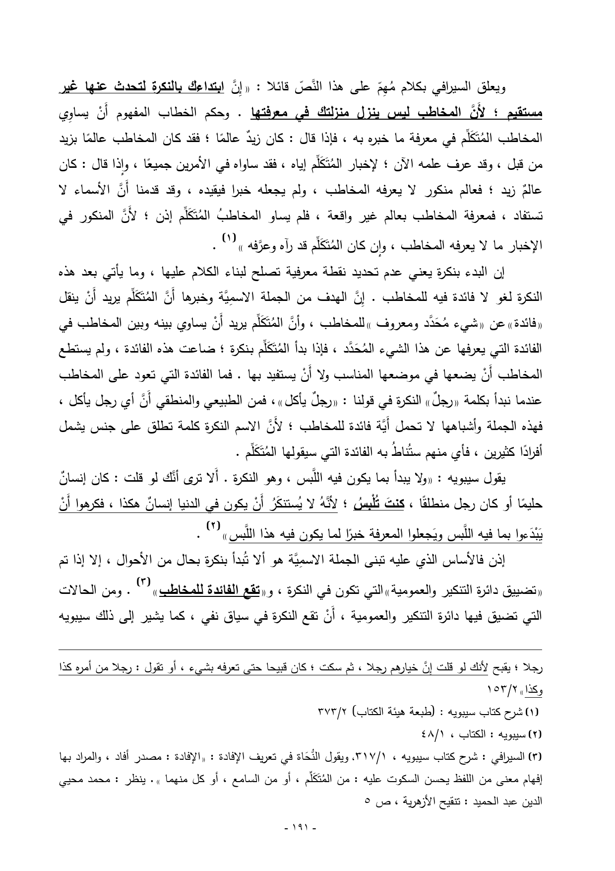 (¬3) السيرافي: شرح كتاب سيبويه، 1/ 317، ويقول النُّحَاة في تعريف الإفادة: ((الإفادة: مصدر أفاد، والمراد بها إفهام معنى من اللفظ يحسن السكوت عليه: من المُتَكَلِّم، أو من السامع، أو كل منهما)). ينظر: محمد محيي الدين عبد الحميد: تنقيح الأزهرية، ص 5