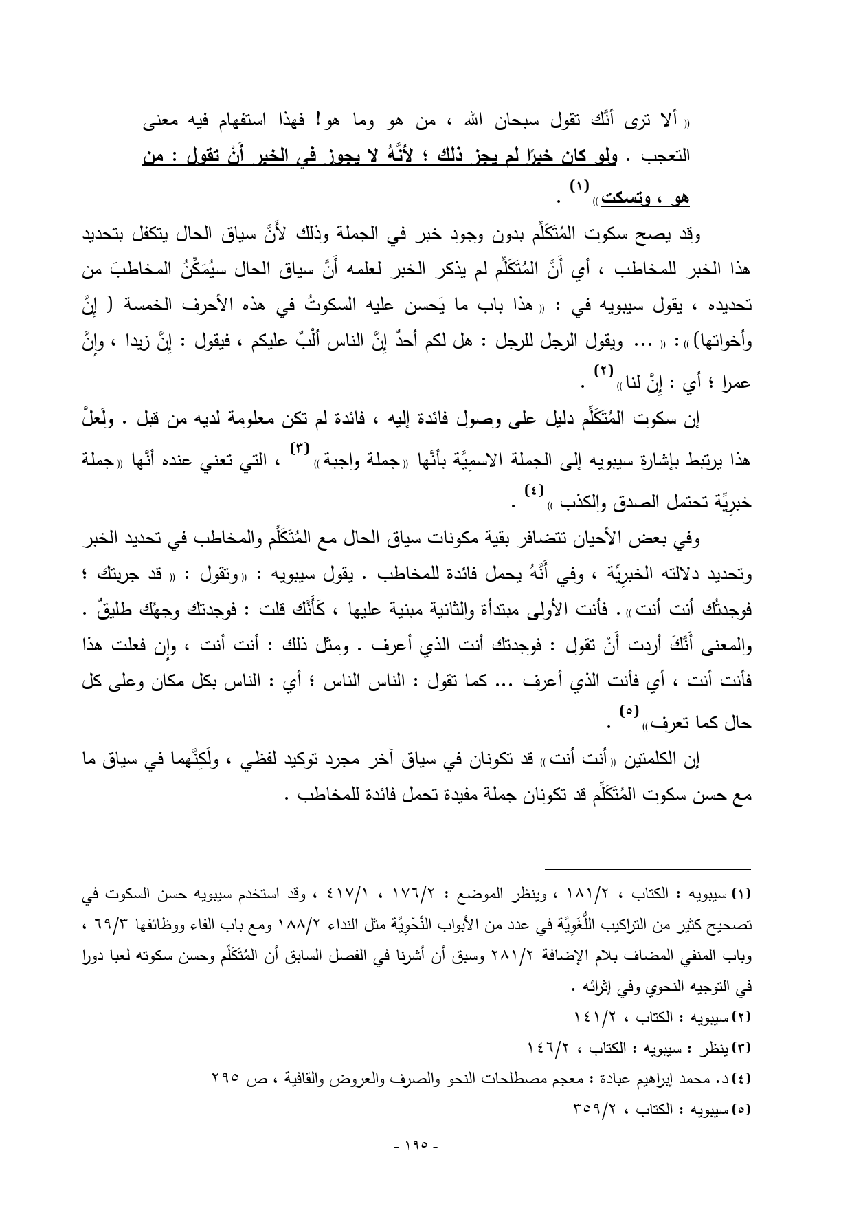 (¬1) سيبويه: الكتاب، 2/ 181، وينظر الموضع: 2/ 176، 1/ 417، وقد استخدم سيبويه حسن السكوت في تصحيح كثير من التراكيب اللُّغَوِيَّة في عدد من الأبواب النَّحْوِيَّة مثل النداء 2/ 188 ومع باب الفاء ووظائفها 3/ 69، وباب المنفي المضاف بلام الإضافة 2/ 281 وسبق أن أشرنا في الفصل السابق أن المُتَكَلِّم وحسن سكوته لعبا دورا في التوجيه النحوي وفي إثرائه.