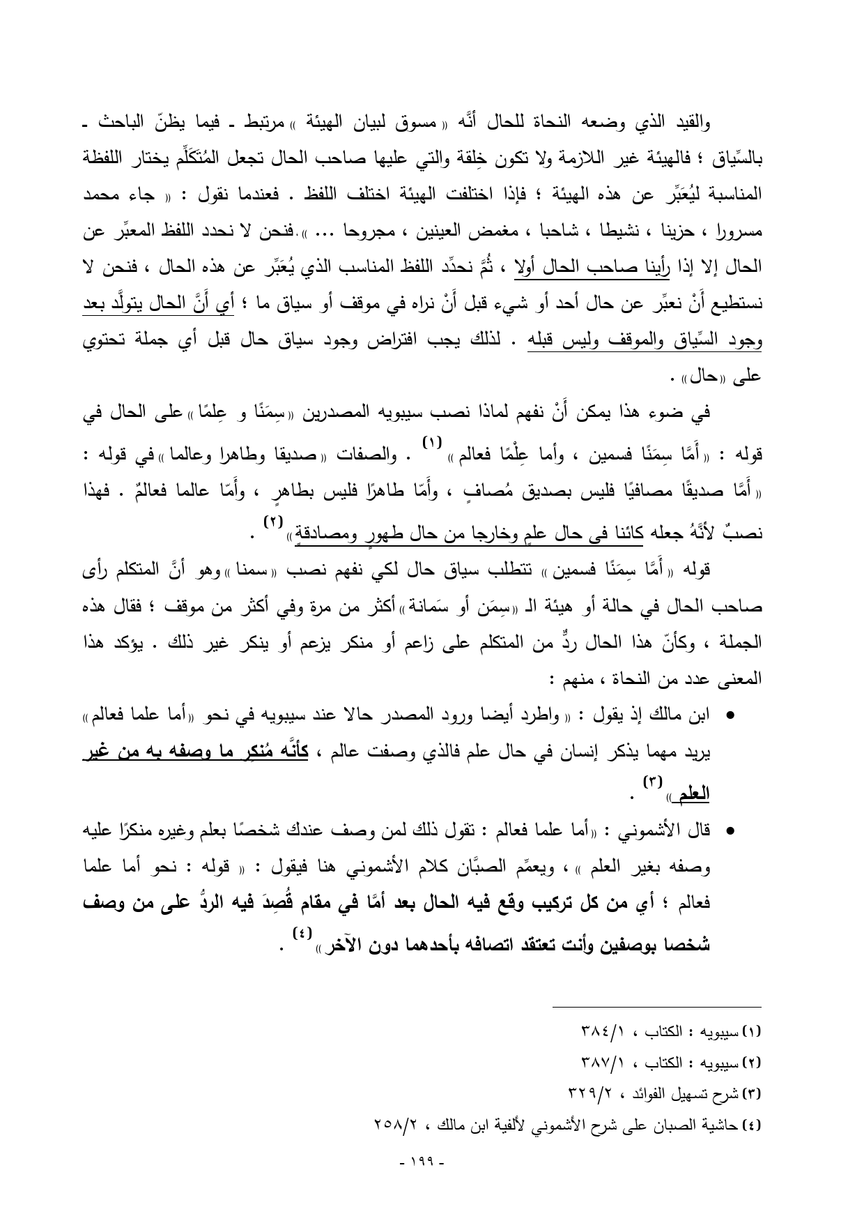 - ابن مالك إذ يقول: «واطرد أيضا ورود المصدر حالا عند سيبويه في نحو «أما علما فعالم» يريد مهما يذكر إنسان في حال علم فالذي وصفت عالم، كأنَّه مُنكِر ما وصفه به من غير العلم») (¬3).